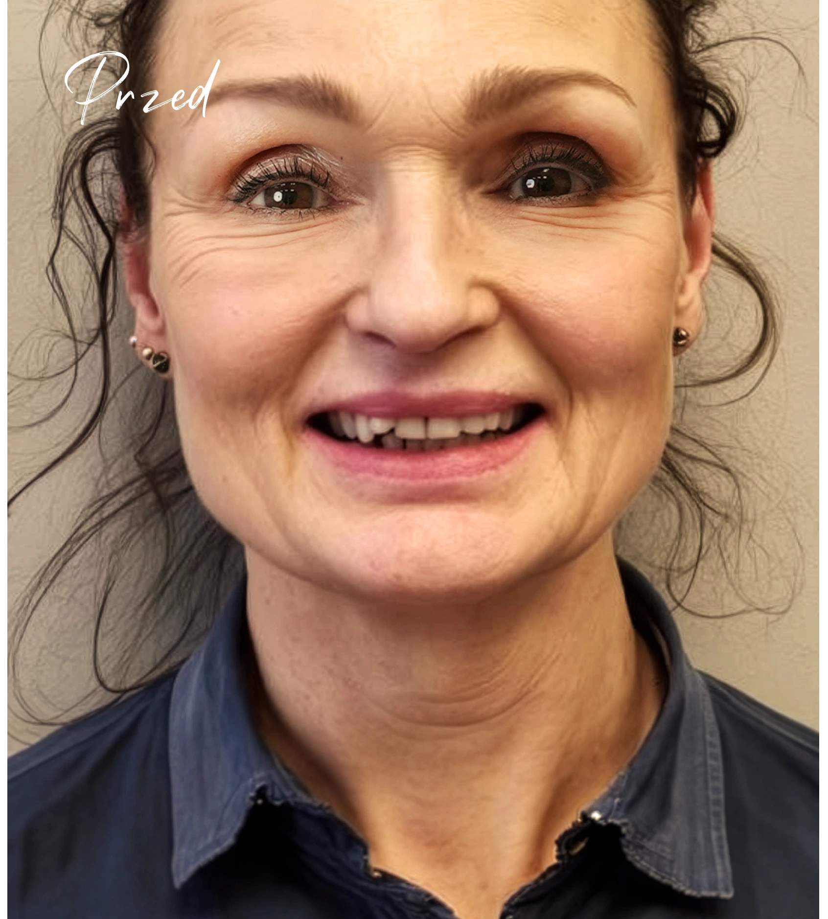 Pani Anna marzyła o tym, by uśmiechać się swobodnie – bez skrępowania, z pewnością siebie i radością, jaką daje zdrowy, harmonijny uśmiech. Niestety przebyta choroba osłabiła cały organizm, również zęby. Mimo to Pani Anna wykazała się ogromną determinacją – nie tylko w walce o zdrowie, ale także o uśmiech, który znów mógby stać się jej wizytówką.